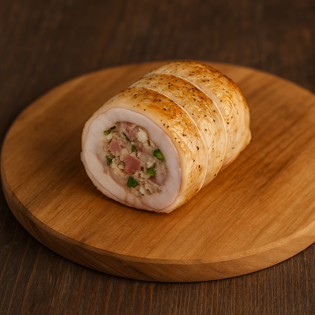 Rolata di coniglio ripiena di prosciutto cotto con salsa al vino bianco e peperoni alla fiamma all’ aceto balsamico